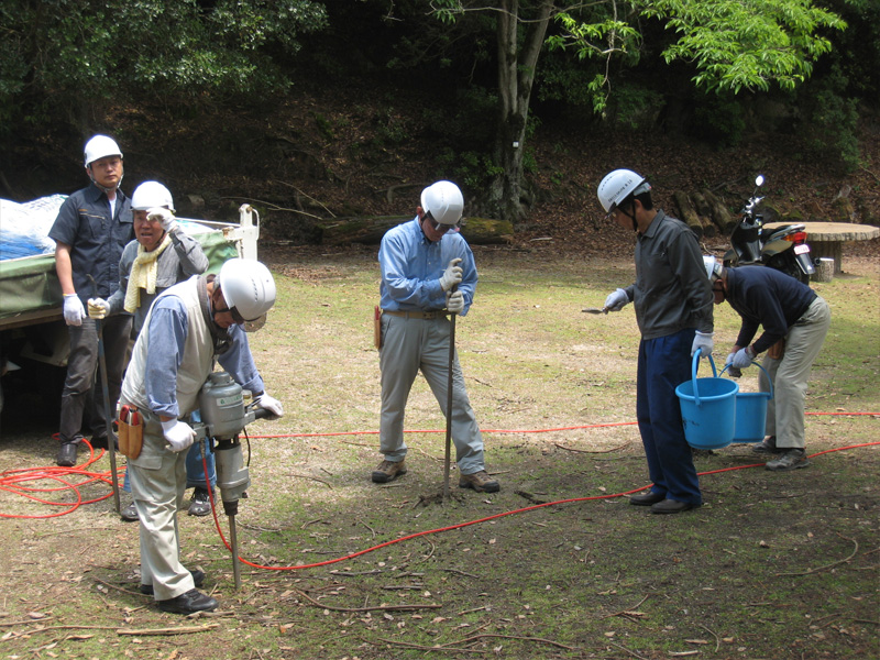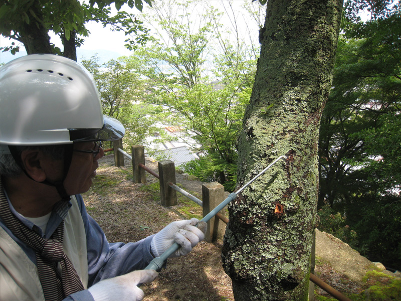 2012年5月26日 害虫の穴に薬剤散布 誓真碑